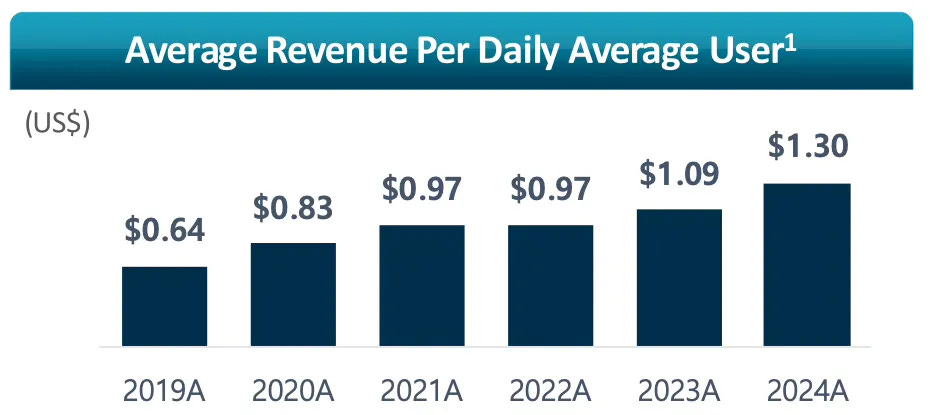 DDI has outperformed peers in converting free users to paying customers, with a Payer conversion rate of 6.9% in Q1 2025. This is well above the industry average of 2-5%